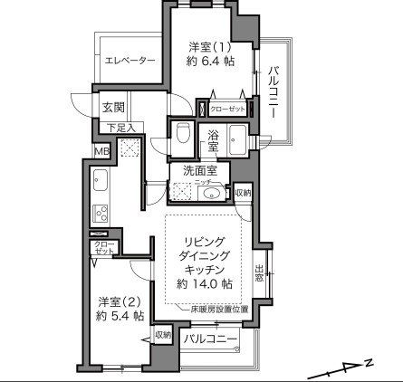 専有面積 | 60.13u | 間取り | 2LDK (LDK14/洋室5.4/洋室6.4) | ||