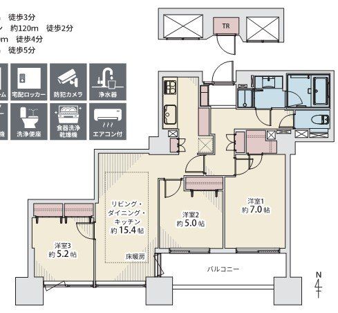 専有面積 | 75.9u | 間取り | 3LDK (LDK15.4/洋室7/洋室5.2/洋室5) | ||