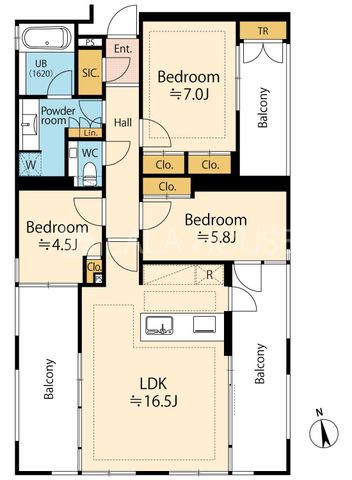 専有面積 | 78.14u | 間取り | 3LDK (LDK16.5/洋室7/洋室5.8/洋室4.5) | ||