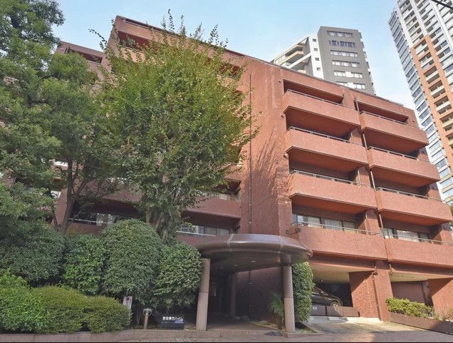【渋谷美竹ハイム】渋谷区渋谷1丁目にある、赤茶色のレンガタイルが印象的な外観のヴィンテージマンションです。