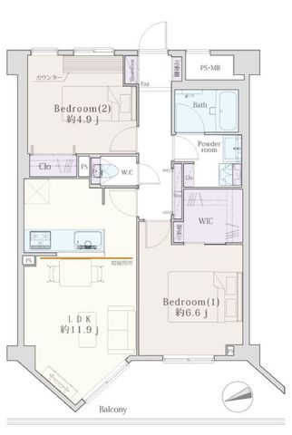 専有面積 | 57.06u | 間取り | 2LDK (LDK11.9/洋室6.6/洋室4.9) | ||