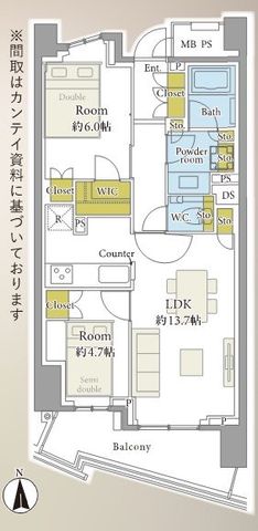 専有面積 57.6u 間取り 2LDK (LDK13.7/洋室6/洋室4.7)