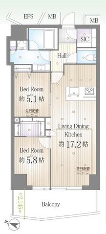 専有面積 67.18u 間取り 2LDK (LDK17.2/洋室5.1/洋室5.8)